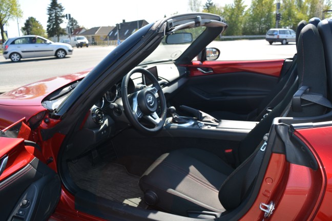 Angående design er den allernyeste MX5er en af de biler jeg først skulle vænne mig til før at man syntes om den. Til og starte med syntes jeg at fronten lignede lidt for meget en halv trist Honda S2000 den manglede lidt det smilende udtryk som de tidligere årgange. Men som månederne går giver designet mere og mere mening. Også indvendigt tager Mazdaen sig godt ud selvom der er lidt meget hård plast i interoiret føles det solidt skruet sammen ligesom at designet er vellykket især detaljer som de indfarvet dørpaneler og semi digital instrument klynge med centralt placeret omdrejningstæller var noget jeg godt kunne lide. Interoiret har også overraskende meget plads fodbrønden har en fin bredde og længde så benplads var der masser af det eneste der trækker lidt ned var bredden på sæderyggen den føles lidt smal for en person på min bredde. Men eller lyder min dom på at MX5 anno 2016 er en værdig arvtager,