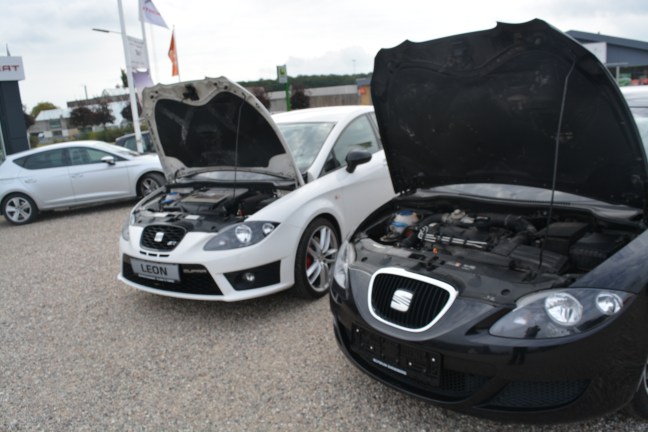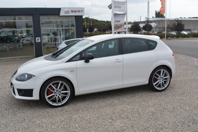 Vi startede dagens test ud med Cupra R udgaven som var en årgang 2010. Allerede efter de første minutter bag rattet kan man godt mærke at det er en rigtig GTI man sidder i. Styretøj og undervogn er mere stramt sat op end standard bilen og da dette eksemplar var udstyret med aktiv styretøj føltes den heller ikke så nervøs på motorvej. Men heldigvis føles undervognen heller ikke knusende hård i det daglige. Efter min mening er det der kan ændre en bils temperament mest er valget af motor. Og der er de to Leons nærmest nat og dag Cupraens 265 heste kan sagtens mærkes i det man bare træder lidt på speederen bundtrækket er solidt samtidig med at maskinen føles responsiv. Og så er der lyden der kommer en raspende lyd fra udstødningen under hård acceleration imens der ved mellemgas er en dyb nærmest bas agtig brummen Jeg syntes at det er en af de få turbo række 4 der har en rigtig god lyd. Gearkassen skifter også lækkert skiftene er mere præcise og skarpe end i standard bilen samtidig med at den har et ekstra trin. Cupraen har også masser af lir til at adskille den fra husholdnings modellerne både inde og ude for eksempel er kofangerne dybere med større luftindtag fælgene er større i diameter samtidig med at bremserne har større dimensioner. Indvendigt er læderrat og sportsstole med til at pifte interiøret gevaldigt op,