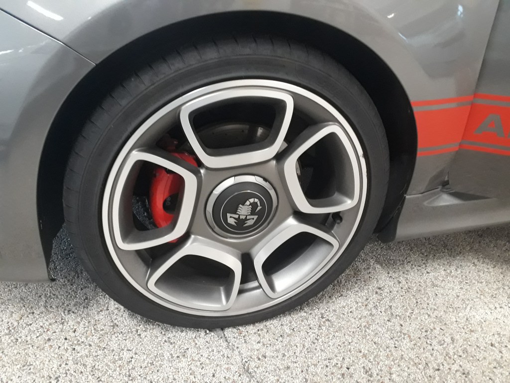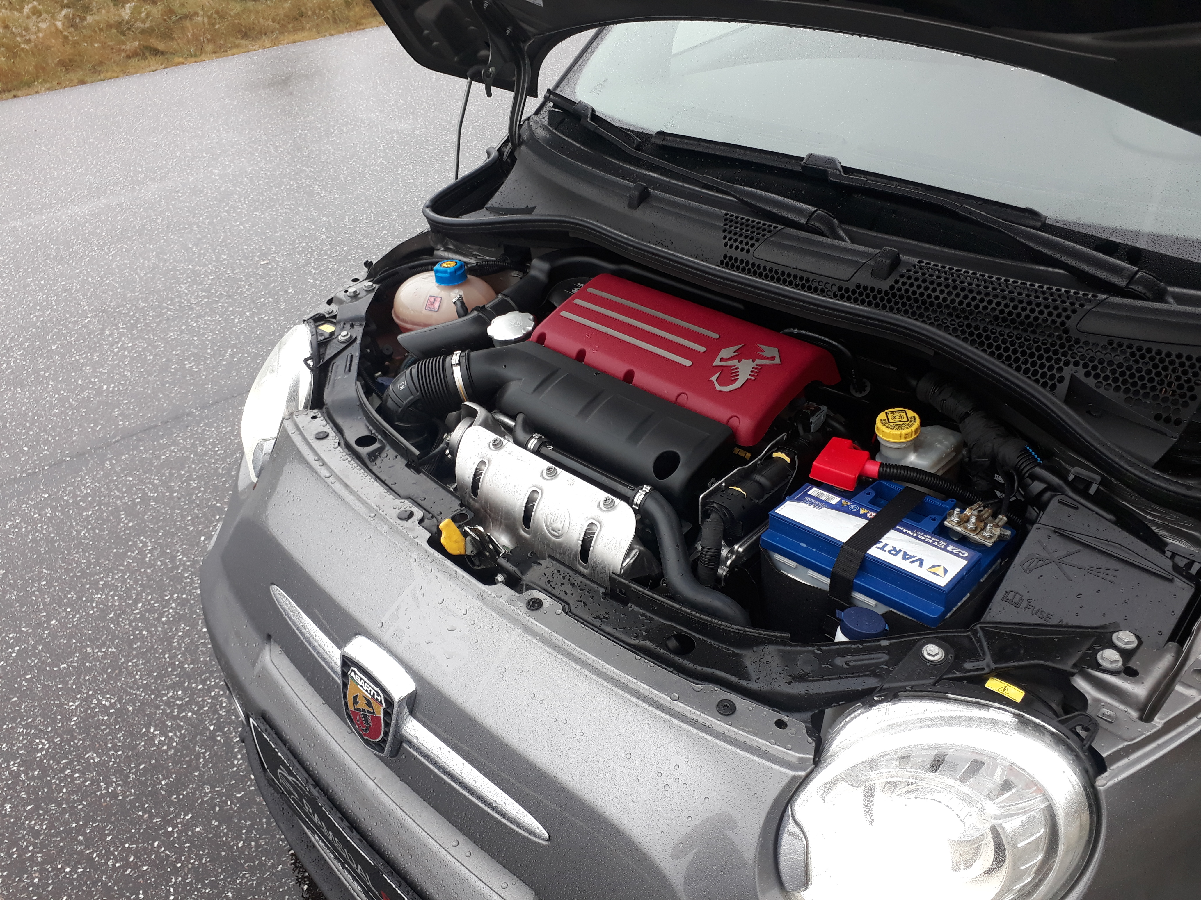 Jeg har ofte sagt at nogle biler med automatgear bare skal køres i fuld automatisk program fordi at manuelt program ikke giver noget særligt til køreoplevelsen. Men med den lille 500 Abarth ville jeg helt klart anbefale at man gør det modsatte. Da jeg hentede den lille hidsigprop startede jeg med at køre i fuld automatisk program både for at prøve hvordan det føles og for at få noget varme i maskinen inden man prøvede at lave nogle træk optil motorvejshastighed. Men at køre i helautomatisk program er en noget rodede og humpende oplevelse som bringer minder frem om at køre i en Citroén C4 Cactus. Den hænger simpelthen alt for meget i gearene samtidig med at gearskift og igangsætning giver nogle underlige ryk i bilen. Men under min research fandt jeg faktisk ud af at dagens testbil ikke er udstyret med en “rigtig” automatgearkasse eller en dobbeltkoblings gearkasse men derimod en 5 trins automatiseret manuel gearkasse. Hvilket jo forklarer den lidt underlige karakteristika. For jeg kan sagtens genkende de kludrede igangsætninger og gearskift fra forskellige personbiler og især lastbiler hvor den type gearkasser er mere udbredt. Men ligeså snart maskinen var blevet varm og sprød prøvede jeg at sætte den i manuelt program og at sætte sportsprogram til. Der går det faktisk meget bedre gearskiftene er meget mere skarpe selvom at man stadigvæk kan opleve en smule tøven når man går et gear ned for blandt andet at lave en overhaling. Igangsætningerne er også mere smidige nu hvor man selv kan vælge hvilket omdrejningstal at man skifter op ved så man ikke sejtrækker for meget ved igangsætning. Men ved frisk kørsel sætter manuelt program og skiftepadlerne virkelig stemningen. Det føles næææææsten som at køre en hel lille Ferrari med at man stryger igennem gearene ved hvert padletryk. Men undervogn og styretøj er også perfekt afstemt til at understøtte den slags leg. Modsat den standard 500 som har et meget let og flydende styretøj med tilhørende city funktion som løsner endnu mere op for det når man skal manøvrere i smalle gyder. Har 595 Abarth et mere stramt styretøj som man forventer i en ægte GTI bil men den styrer også ganske præcist. Jeg ville ikke sige at den føles som om den er på skinner men den føles absolut ikke vag på nogen måde. Undervognen føles hård og kontant men fordi at dette eksemplar er udstyret med bekvemmelige touringsæder modsat den hardcore Biposto udgave som er møbleret med tyndt polstret skålsæder henter man meget af komforten tilbage. Men ligesom andre højtydende forhjulstrækkere kæmper 500eren lidt med at kunne sætte alle hestene i asfalten under acceleration jeg måtte rulle gassen lidt ind for at undgå for megen hjulspind når man skal lave en effektiv og smidig start. Men modsat andre GTIere oplevede jeg ikke noget moment reaktion som også er noget der plager forhjulstrækkere når antallet af heste eller omdrejningsmomentet stiger. Men Abarthen føles stadigvæk hurtig til og med de 60 i timen. Kraftudviklingen sker med det samme og sker eksplosivt det føles virkeligt som om at der ikke er meget der kan følge med. Men den illusion splintres lidt når man passere 70 i timen for der kan man godt mærke at luften lidt går af ballonen den trækker simpelthen ikke ligeså vildt og voldsomt som fra 0 til 60. Dog kan man sagtens stadigvæk køre på motorvej og overhale på motorvej uden nogle som helst problemer men man har bare ikke det mægtige kraftoverskud over hele registret som i en powersedan eller en superbil. Men at boldre sig i de snogede landeveje og spurte op til 60 i timen er det at 500eren er virkelig god til og det er også ganske morsomme manøvrer at foretage sig især når man har lyden af knaldperler der går af i udstødningen som underlægningsmusik. For hvis du kan lide lyden af knaldperler så er det her helt klart bilen for dig. Men spøg til side så synes jeg oprigtigt at denne bil har en ganske fin motorlyd. Ved tomgang står den og brummer som en tunet Volvo BM traktor. Og ved acceleration snerrer den herligt imens at hvert gearskift afgiver et højlydt knald. Men det er især når man slipper gassen at knaldperlerne kommer i spil. Modsat A45eren som udsteder en enkelt højlydt prut ved hvert nedskrift udleder 500eren en serie af fyrværkeri agtige knald hver gang gasspjældet lukkes.