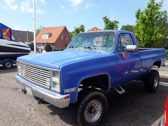 Da der blev fyret op for den Porsche-blå Silverrado stod det klart at det ikke var en BMW man skulle ud og køre i. 454 kubiktomme V8eren der var udstyret med en skarpere knastaksel end standard springer igang med et olmt brøl hvorpå at stå og rulle nærmest rytmisk med tomgangen. Der er et eller andet afstressende og tilfredstillende ved at høre en Amerikaner V8ers hjertebanken. Også under kørsel føles det som at køre en stortromme eller en fiskekutter. Der kommer en herlig raspen fra de to mellempotter under vognen imens at der kommer der et ordenligt fnys fra indsugningen når man giver dyret noget speeder. Hvordan er den så at køre i spørger I sikkert. Og det kan jeg så fortælle om nu her. Silverradoen er en af de biler der føles større ude i trafikken end den ser ud. Det føltes meget som at køre en lille lastbil med at man skulle begynde at dreje en smule tidligere for at få hele vognen med rundt i et sving end man ville gøre i en mindre bil. Især i den smalle hovedgade i Tarm føles det helt som en gadelegal monstertruck når de andre kørte Toyota Aygo og Ford Fiesta. Men på åben vej føles den absolut ikke så værst. Offroad dækkene gav en smule mere rullestøj og rystelser fra sig end normale vejdæk men det distraherede ikke særligt meget. Og da man har en motor på hele 7.4 liter eller 454 kubiktommer har man selvfølgelig en rimelig velvoksen karburator. Så man skulle have et lidt højere tryk på gaspedalen under igangsætning for at overkomme modstanden i gasspjæld hængsler og kabel. Men efter et par minutters kørsel var det noget der sad på rygraden igen. Og derfra var det bare plain sailing der var masser af boost på servostyringen og ikke så meget føling med vejen. Og fordi at det her var en pickup truck med stigeramme under karrossen vandrede den også ned af vejen på samme måde som alle andre biler med body on frame har tendens til. Og da min egen bil gør det samme er det efter min mening lidt charmen med at køre en bil med sådan en konstruktion hvor jeg altid har beskrevet at det føles som at ride på en elefant med at man sidder oven på chassiset istedet for inde i det. Og så synes jeg bare at man godt må kunne mærke at det er en ladbil man kører i og ikke en sportssedan. Det er også grunden til at jeg elsker at nyde en god Amerikanerbil i ny og næ. Fordi at modsat mange af de Europæiske biler som giver en meget forfinet køreoplevelse med et stærkt lokalt præg afhængigt af bilens oprindelsesland og hvor at oplevelsen ofte bliver båret og leveret af imponerende finmekanik og teknologi som tilfredstiller brugeren/førerens basale instinkter når bilen betjenes. Så leverer mange US biler en hudløs ærlig og analog køreroplevelse hvor det mere handler om hvordan man kommer frem end hvor hurtigt man kommer frem. Bare det at betjene lyskontakten når man skulle sætte kørelys på føltes mekanisk og lige til. Det føltes som om at man pillede ved hovedafbryderen i elskabet på en etageejendom. Ikke synderligt elegant men stadigvæk vildt tilfredstillende. Også det at bilen giver et betryggende lille ryk når man trækker gearvælgeren ned til drive er en lille ting der giver noget herligt til den overordnet køreoplevelse. Men efter at have tilbragt min stund med denne herlige Silverrado kan jeg sige at det er herligt at blive Amerikaner rehabilliteret og at det føles herligt at få kørt noget Detroitstål igen.