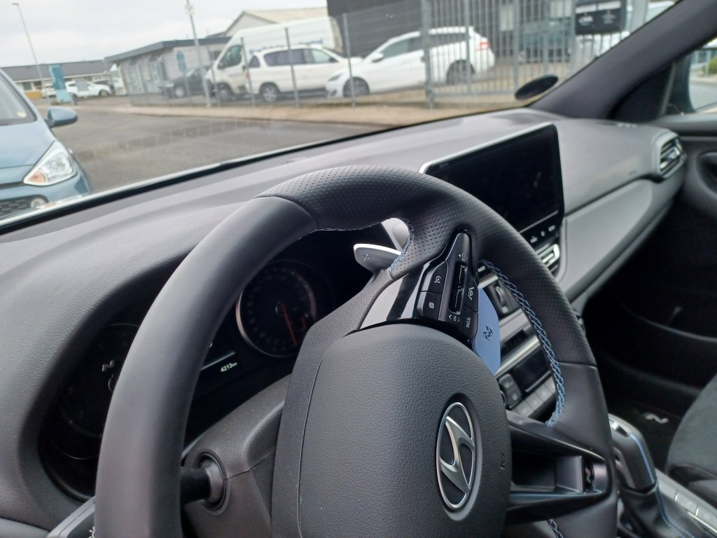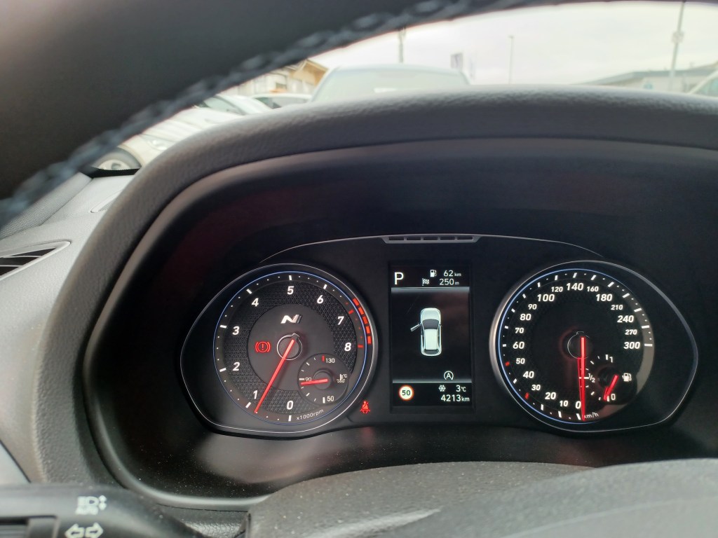 Jeg kan allerede sige nu at det her er en bund-solid GTIer der giver de etablerede aktører kamp til stregen. Bare hvis vi ser på teknikken mangler i30N ikke noget i forhold til konkurrenterne. Man har blandt andet 8 trins dobbeltkoblings-gearkasse elektronisk spærredifferentiale og antilag. Sidstnævnte er meget usædvanligt at se standard gadebilsmotorer være udstyret med. Men den kører heldigvis også som en rigtig hot hatchback. Selvfølgelig kan man godt mærke at den føles mere rolig eller hvad man nu skal sige. Nu hvor det er en smule større bil i forhold til i20N med længere akselafstand. Men undervognen er stadigvæk hård og kontant og så er styretøjet tungt vægtet imens at det styrer præcist. Indretning af førerpladsen er også lige som det skal værre. Man har et par godt polstret forstole der støtter virkelig godt om én og éns forsædepassager. Og så er knapper til klimaanlæg og gearvælgeren logisk udformet og placeret. Så det er intuitivt at betjene. Angående gearkasse er man også godt stillet. Selvom at den 6 trins manual er det åbenlyse valg for køre-entusiasten så er den 8 trins DCT med vådkobling en rigtig fornem gearkasse. Den skifter næsten ligeså smidigt ved stille kørsel som nogle af de bedste konverter-atomatgearkasser at jeg har kørt. Men hvor at man stadigvæk har lynhurtige og præcise skift under en hurtig acceleration. Og det er lige meget om det i manuelt eller automat-program. Og det at accelerere er noget at i30eren er rimelig god til. Fra 0 til 60 i timen føles den ikke ligeså eksplosiv som lillebror i20N. Hvorimod at ved mellem-accelerationer fra 60 til omkring 130 i timen der flyver den til gengæld godt. Man kan i hvert tilfælde godt mærke at man har de ekstra kubik i forhold til i20. Det eneste minus hvis man overhovedet kan kalde det det. Er at man ikke har digital instrumentering som i i20. Men det ænser jeg ikke da jeg er vant til gamle biler som slet ikke har nogen former LCD paneler i instrument-klyngen.