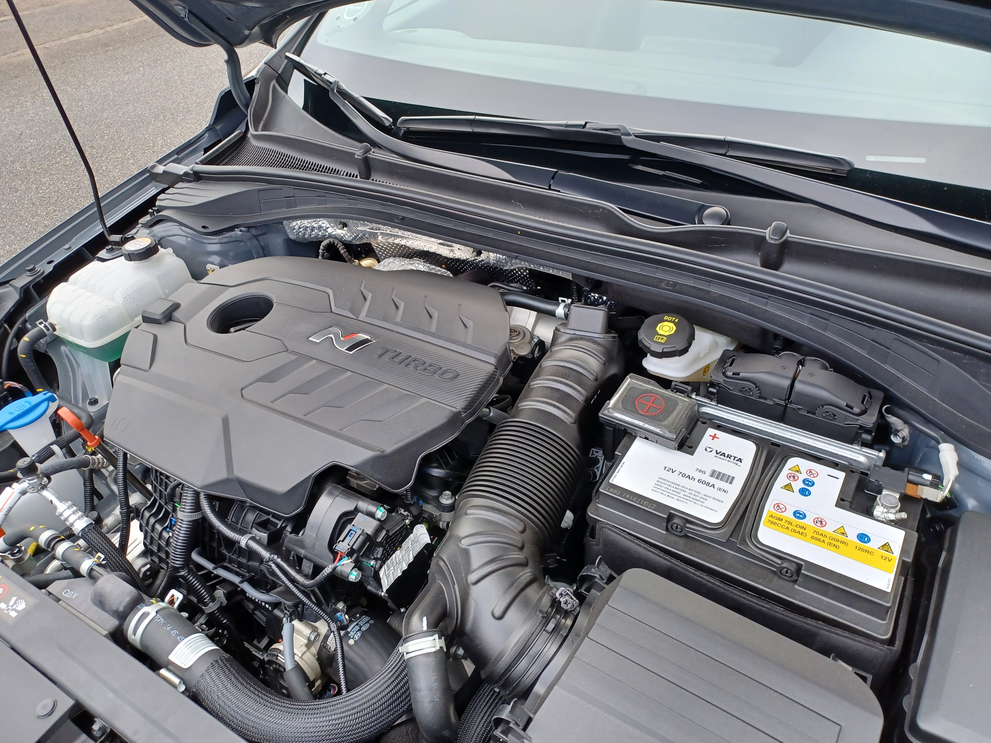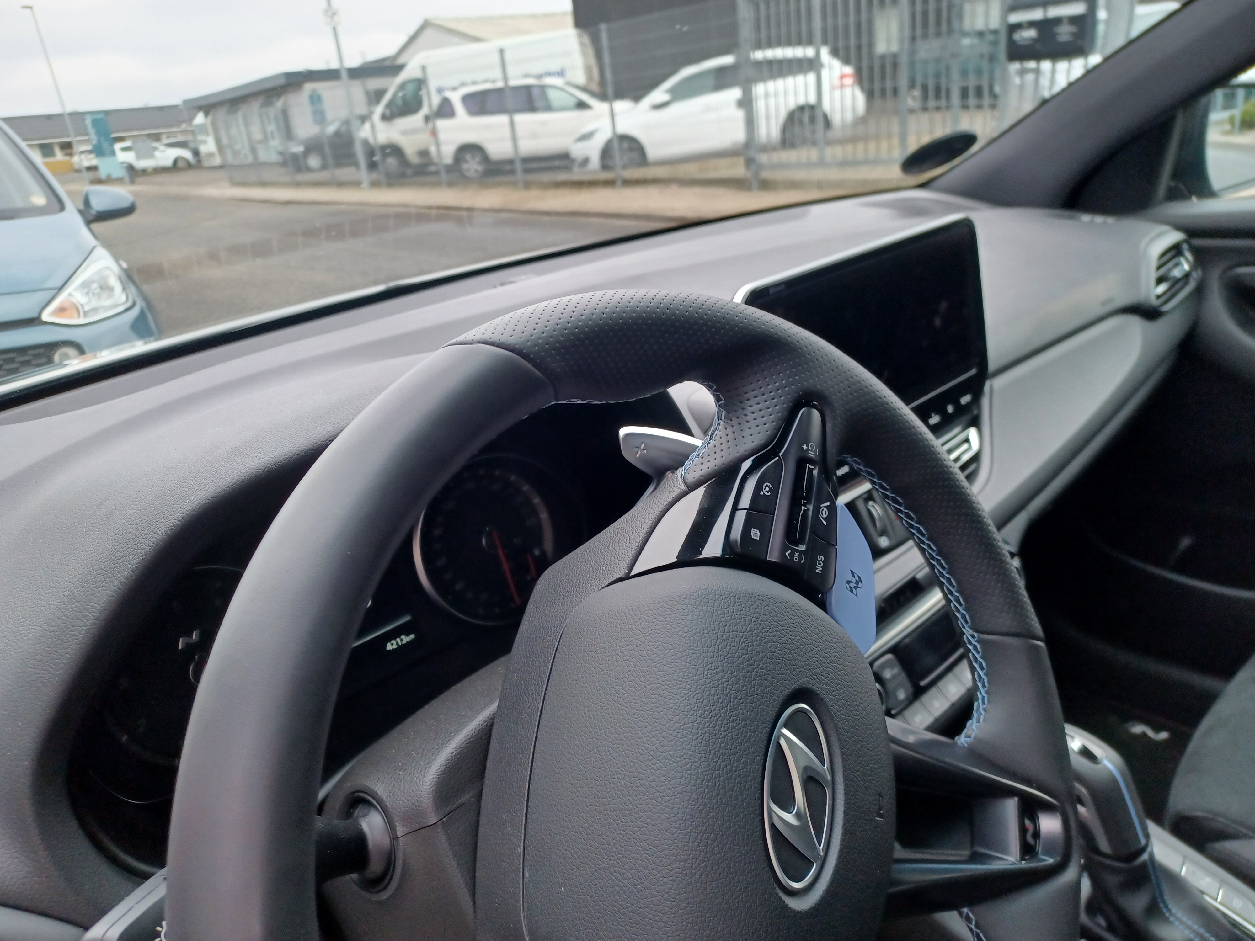 Jeg kan allerede sige nu at det her er en bund-solid GTIer der giver de etablerede aktører kamp til stregen. Bare hvis vi ser på teknikken mangler i30N ikke noget i forhold til konkurrenterne. Man har blandt andet 8 trins dobbeltkoblings-gearkasse elektronisk spærredifferentiale og antilag. Sidstnævnte er meget usædvanligt at se standard gadebilsmotorer være udstyret med. Men den kører heldigvis også som en rigtig hot hatchback. Selvfølgelig kan man godt mærke at den føles mere rolig eller hvad man nu skal sige. Nu hvor det er en smule større bil i forhold til i20N med længere akselafstand. Men undervognen er stadigvæk hård og kontant og så er styretøjet tungt vægtet imens at det styrer præcist. Indretning af førerpladsen er også lige som det skal værre. Man har et par godt polstret forstole der støtter virkelig godt om én og éns forsædepassager. Og så er knapper til klimaanlæg og gearvælgeren logisk udformet og placeret. Så det er intuitivt at betjene. Angående gearkasse er man også godt stillet. Selvom at den 6 trins manual er det åbenlyse valg for køre-entusiasten så er den 8 trins DCT med vådkobling en rigtig fornem gearkasse. Den skifter næsten ligeså smidigt ved stille kørsel som nogle af de bedste konverter-atomatgearkasser at jeg har kørt. Men hvor at man stadigvæk har lynhurtige og præcise skift under en hurtig acceleration. Og det er lige meget om det i manuelt eller automat-program. Og det at accelerere er noget at i30eren er rimelig god til. Fra 0 til 60 i timen føles den ikke ligeså eksplosiv som lillebror i20N. Hvorimod at ved mellem-accelerationer fra 60 til omkring 130 i timen der flyver den til gengæld godt. Man kan i hvert tilfælde godt mærke at man har de ekstra kubik i forhold til i20. Det eneste minus hvis man overhovedet kan kalde det det. Er at man ikke har digital instrumentering som i i20. Men det ænser jeg ikke da jeg er vant til gamle biler som slet ikke har nogen former LCD paneler i instrument-klyngen.