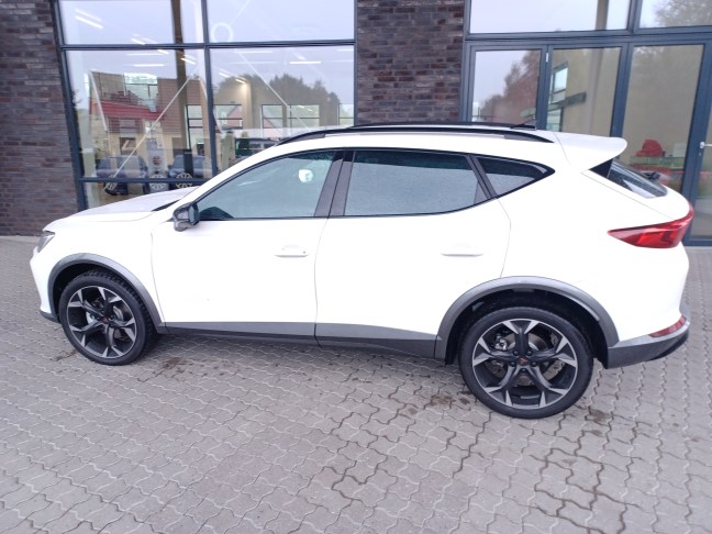 I kender sikkert typen som prøver at spille hård hele tiden. Hvor at vedkommende i sandhed er ganske almindelig måske endda småkedelig. Men at de påtager sig en persona for at virke mere interessante. De tendenser har jeg også set indenfor bilverden med at nogle gennemsnitlige biler er designet til at se så vrede ud men hvor at de i realiteten er ganske tilforladelige eller måske endda gennemsnitlige. Gode Eksempler på dette er blandt andet Civic MK10 som selv i basisudgaven har et design der efter min mening ligner en deform Transformers med ADHD der har parret sig med en nedstyrtet rumfærge. Men hvor at det bare er en meget gennemsnitlig bil der ofte bliver leveret med CVT gearkasse. Et andet godt bud på en virkelig tam men vredt udseende bil er hvilken som helst Mercedes C200 W205 med AMG line pakke. Den ser bare så vred og dyr ud men hvor at det bare er en tavelig dieselprut at der ligger under motorhjelmen hvor at det lyder som om at man kører Fiat Ducato. Og det med at sætte en facade op er noget at jeg synes netop at Formentor gør selv i den testede 1.5 liters variant. Den spiller stort på den der fake wannabe GTI stil hvor at motoren snerrer aggressivt når man accelerer. Jeg synes det er lidt upassende at basismodellen ligner performancemodellerne så meget da det efter min mening udvander ekslusivitets-følelsen af performancevarianterne. For der findes både en Formentor VZ5 der måske og måske ikke kommer her til landet der har 390 heste fra en 5 cylindres maskine. Samt en ren fossilvariant der yder 310 heste. Det jeg prøver at sige er at jeg ville ønske at producenterne var lidt mere ærlige med deres designs ved ikke have en ustyrlig trang til at gøre selv deres basismodeller til vrede edgy over the top wannabe racere der kun har det hele i designet og ikke kan meget mere end at køre til bageren en Søndag morgen. For rent objektivt er Formentor TSI en helt iorden brugsbil der gør mange ting ganske fint. Til at starte med så sidder man faktisk rigtig godt fortil. Man sidder meget komfortabelt imens at man bliver støttet rigtig fint. Jeg synes oprigtigt at det er bedre forstole end på nogle decideret entusiastbiler at jeg har kørt igennem tiden når det kommer til polstring og støtte. Noget andet positivt er infortainmentsystemet og den generelle mængde teknologi. Man har en touchskærm som reagere fint på ens input samtidigt med at den grafiske brugerflade er logisk indrettet. Dog kunne jeg godt værre de trykfølsomme knapper til lygteindstillinger foruden hvorså at man havde en gammeldags drejekontakt eller lignende. Og så måtte der godt værre bare en smule flere af funktionerne der blev betjent af en fysisk knap i stedet for med skærmen. Det er bare min gammeldags mening. Men det er faktisk ikke så værst og så har man også en heldigital instrumentklynge som kan konfigureres lidt med rat-betjeningen. Køreegenskaberne er faktisk også helt iorden. Den kører mere skarpt end en MG EHS men stadigvæk mere komfortabelt end en Mercedes GLE 43. Med andre ord er undervognen ganske fint afstemt imellem komfort og dynamik imens at styretøjet styrer let og flydende ved lave hastigheder hvorpå at stramme op ved hastigheder på over cirka 80 i timen. Man har også sport og økonomi køreprogrammer som ikke påvirker undervogn og styretøj men kun gearkasse mapping speederrespons og om start stop funktion er slået til. Det kunne diskuteres om der var nogen mærkbar forskel på køreprogrammerne da jeg ikke mærkede noget særligt og at man også kan bruge skiftepadlerne i økonomi-program. Angående motor og gearkasse er man også godt stillet. Den 7 trins DSG skifter meget smidigt ved stille kørsel man kan virkelig mærke at VAG har forfinet denne type gearkasse siden lanceringen tilbage i 00erne når det kommer til letkørthed og komfort. Men ligesom med andre dobbeltkoblingsgearkasser skifter den også kontant og præcist under hård belastning men hvor at den stadigvæk ikke kan måle sig med Hyundai i30N performance. Motoren er som nævnt i titlen en 1.5 liters. Det er en fuldt ud moderne motor der er forsynet med direkte indsprøjtning og turbo. Den levere kræfterne ganske smidigt og så føles den faktisk ganske kvik op til omkring 70 i timen hvor at man godt kan mærke at effektkurven flader lidt ud.