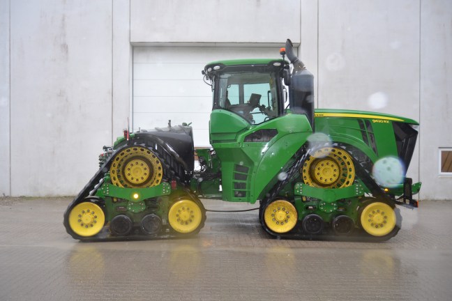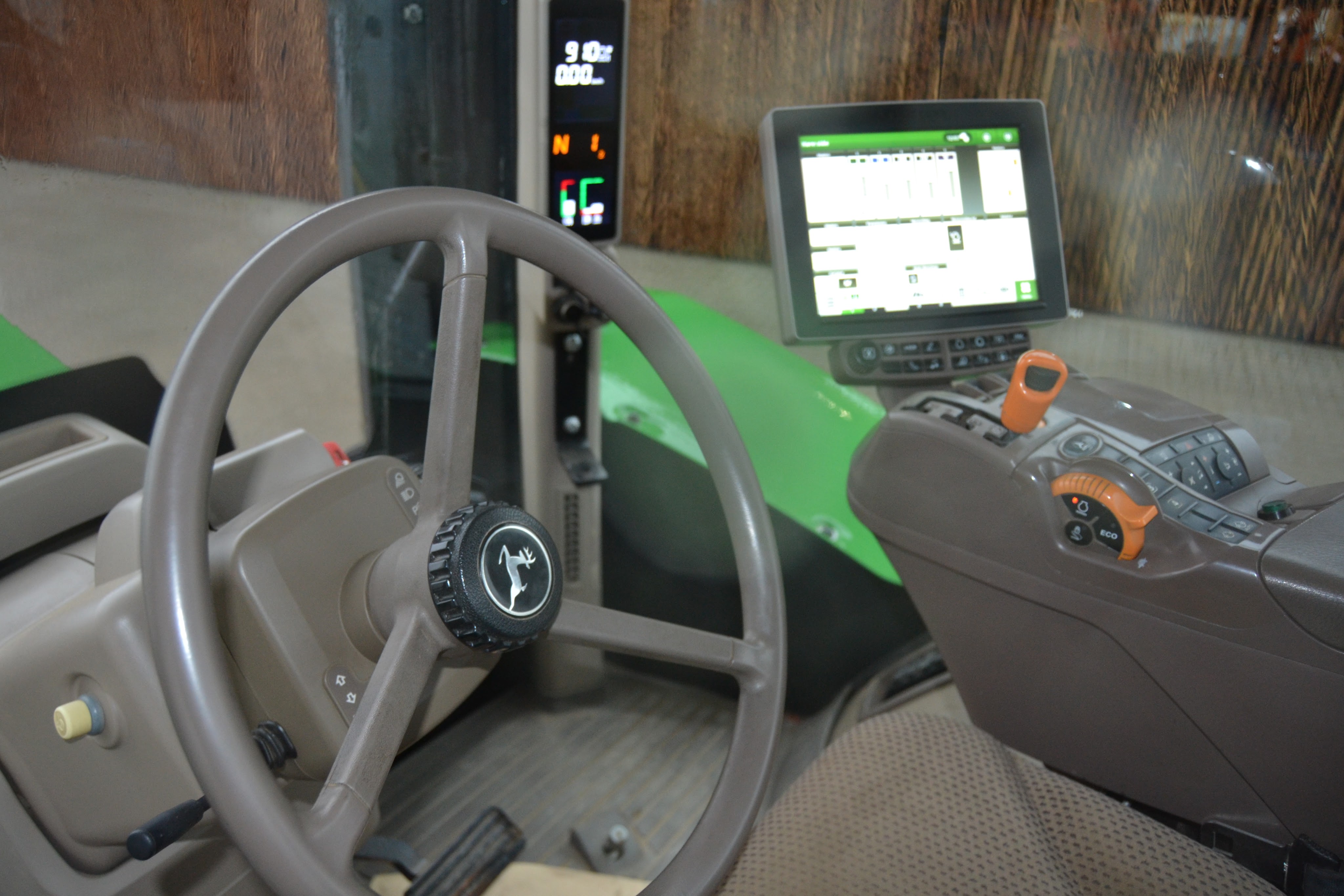 Det første jeg lagde mærke til når man kører 9620er er at den faktisk er mere letkørt end 9630Teren at jeg kørte sidste år. Hvis man ikke er fortrolig med det kan det godt komme bagpå én at 9630eren kan dreje om sin egen akse hvis man ligger for meget styreinput ind. Hvorimod at 9620eren styrer som en stor gummiged. Men det er stadigvæk en speciel følelse at køre med knækled i traktor da der ikke er så mange af dem der kører med denne konfiguration. Blandt andet kan man mærke at førerhuset ryster i takt med at man drejer. Men også den detalje med at man kan se hele bagenden bevæge sig fra side til når man orienterer sig bag ud er lidt et særsyn når man som mig mest er vant til traktorer med styring på forakslen. En ting der dog er fælles for alle bæltetraktorer at jeg har lagt mærke til er at bælterne æder en smule af komforten når man kører på asfalt eller andet fast underlag i forhold til hjul med lavtryksdæk som man normalt ser på landbrugsmaskiner. Der er en lavmeldt rysten under kørslen lidt som når man kører med terrændæk på bilen. Men fordelene ved bælter overvejer åbenbart denne karakteristika. Ellers kan jeg nævne at man har det meget lette men også meget præcise styretøj som er normalt på alle moderne traktorer. Når man stiger op i hytten kan man godt se at det er en lidt nyere maskine end 9630eren. Flere af de fysiske knapper er rykket ind i touchskærmen for enden af førerens højre armlæn. Alt fra motorværdier til handsfree telefon og klimaanlægs-indstillinger kan tilgås fra skærmen af. Men jeg synes også ergonomien er blevet forbedret. Bare det med at man betjener visker vasker og lys med knapper på ratstammen modsat at skulle række over til styrepulten er en opgradering. Hvis vi tager et kig på de generelle specifikationer kan man godt se at man igen er oppe i den ekstreme ende af skalaen. Man har en totallængde på omkring 8 meter imens at akselafstanden er omkring 4.1 meter. Forsendelses vægten er på omkring 25 tons. Motoren er en Cummins QSX15 række6er med en slagvolumen på 912 kubiktommer eller 14.9 liter. Men ellers lyder dommen på at det var spændende at opleve én af kæmperne igen på tæt hold. Og at jeg havde mulighed for at dele det med jer læsere atter en gang. Som jeg altid siger så elsker jeg at føre noget stort og kraftfuldt maskineri ligemeget om det er på marken vejen eller andetsteds. Og at det denne gang ikke var spor anderledes.