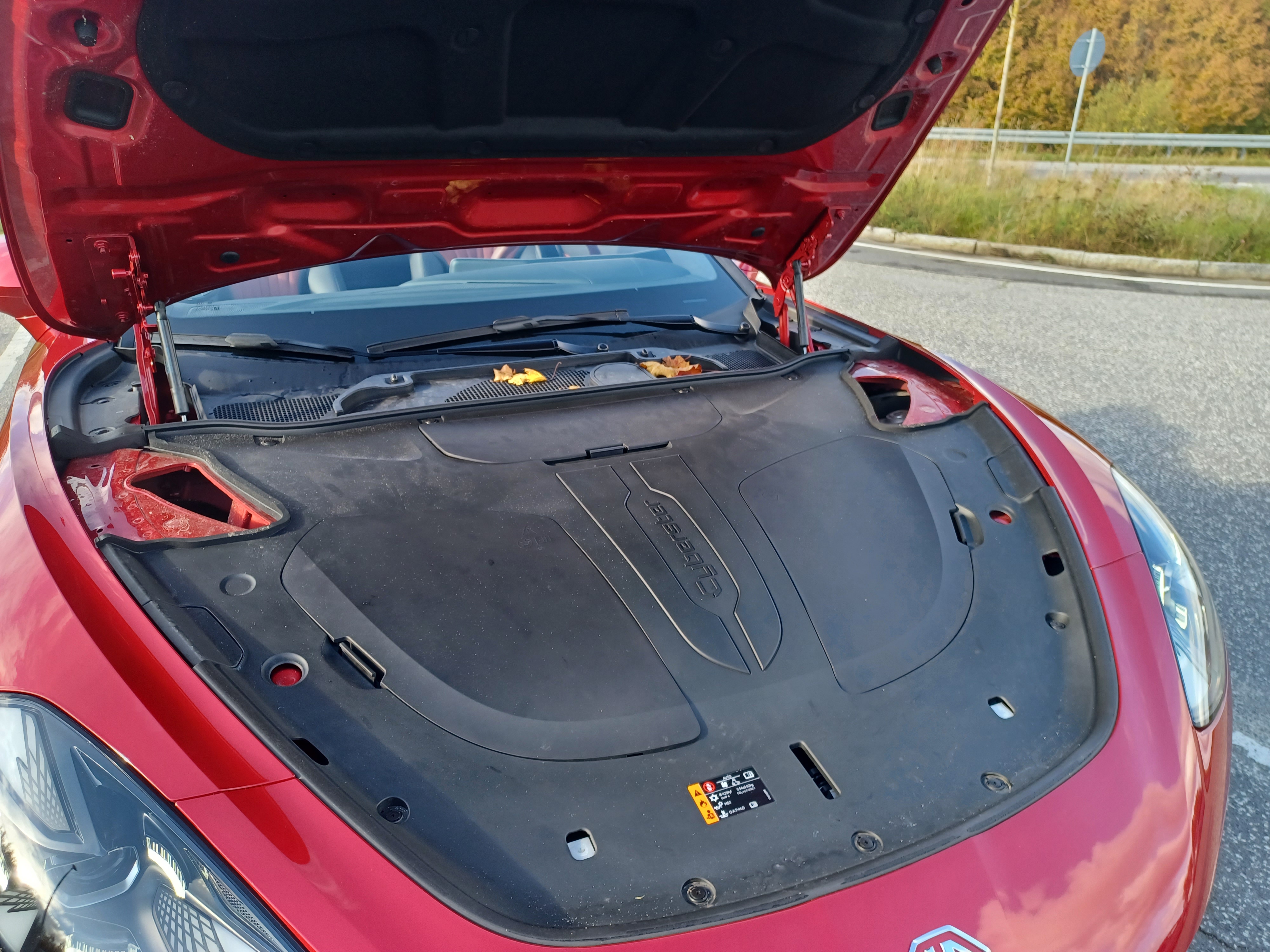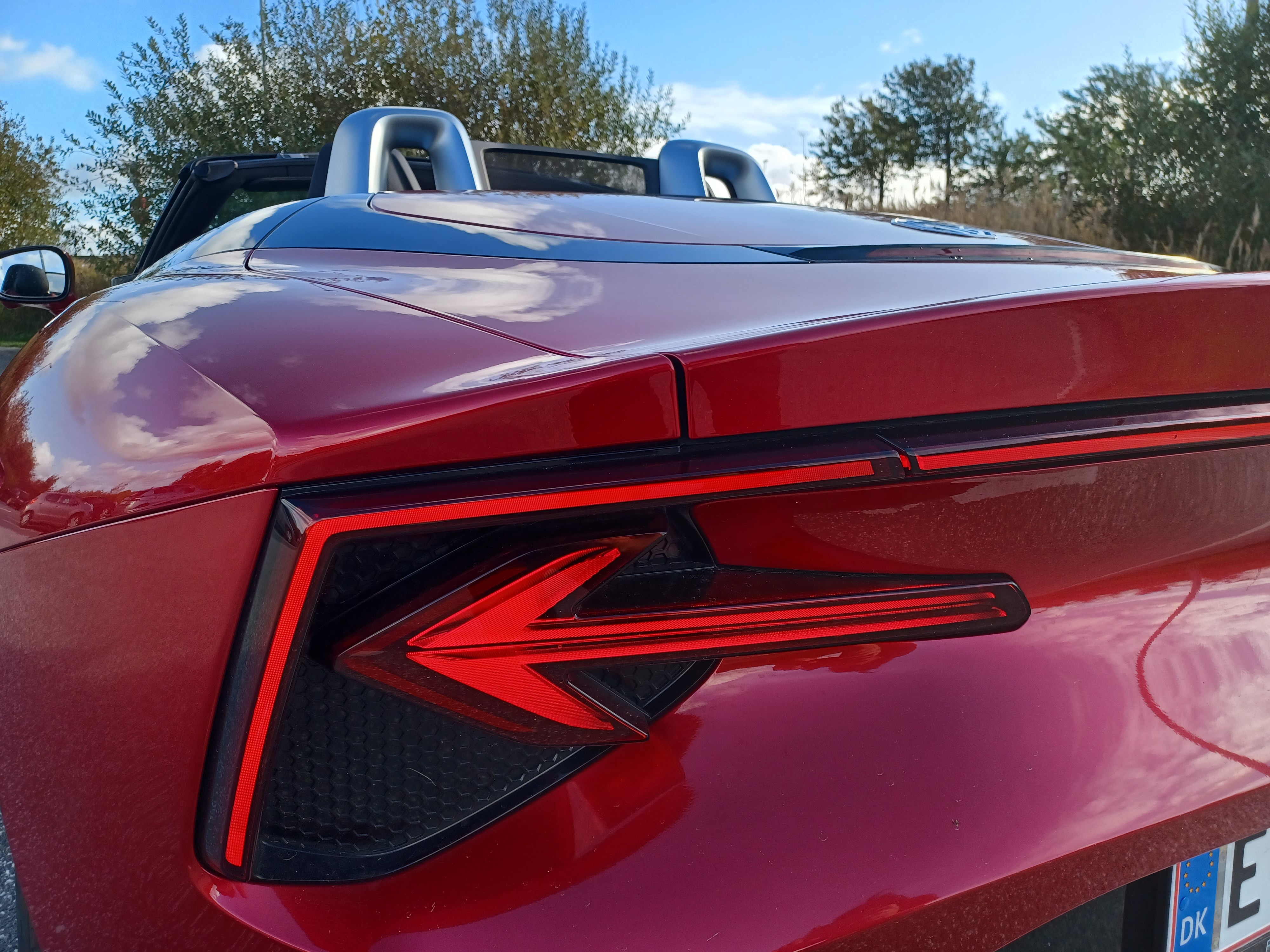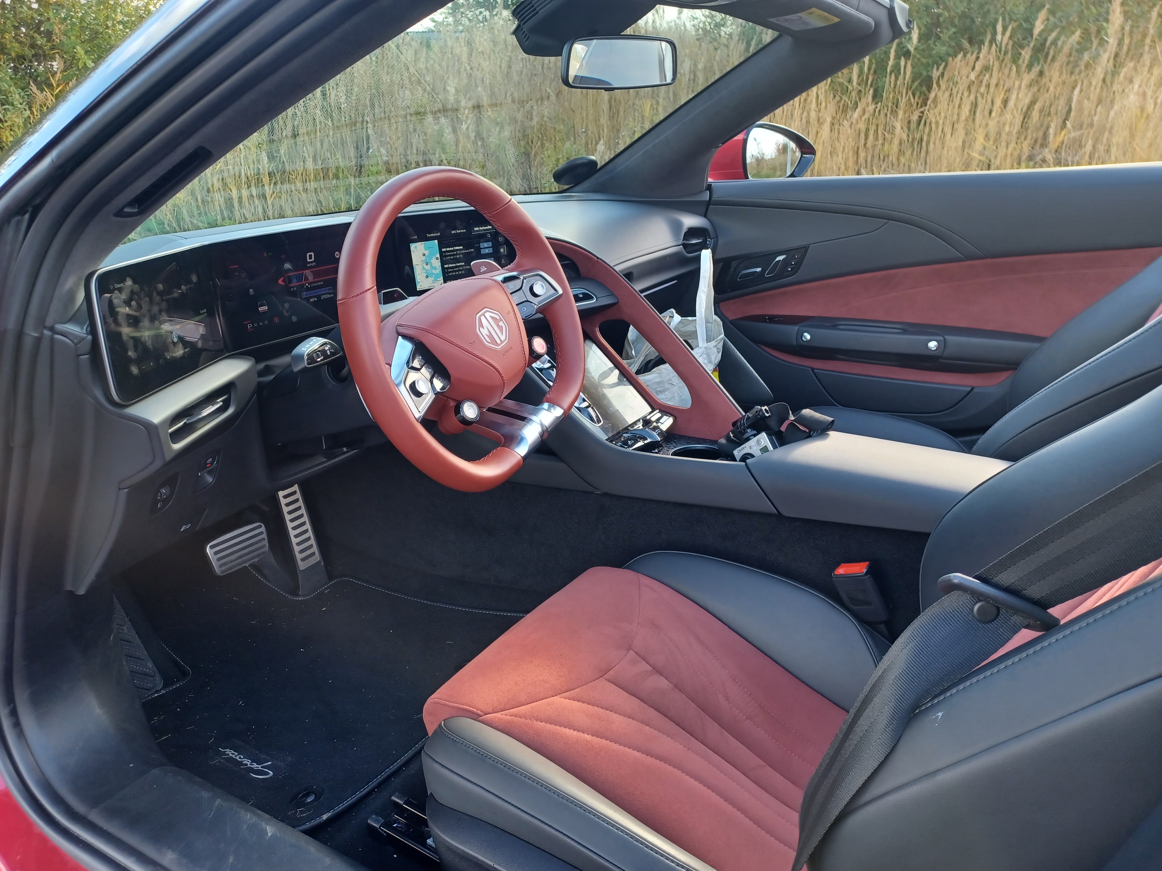 Det første pluspunkt at jeg ville give Cybersteren er den måde at MG har præsenteret den på med hensyn til design kvalitetsfornemmelse og komfortudstyr. Jeg synes virkelig at de har solgt præmissen om en ultramoderne eksotisk udseende roadster på fornemmeste vis. Fronten er der næsten noget Alpine A110 over hvilket faktisk er ment som et kompliment imens at bagenden er eksekveret meget dramatisk med den komplekse LED belysning som danner et union-jack mønster. Hvorimod at den set fra siden med taget slået op antager sig en næsten Aston Martin agtig silhuet. Men saksedørene er nok den største samtalestarter. Jeg giver normalt ikke noget for saksedøre der er monteret på biler som ikke er en Lamborghini. Men jeg synes at de passer helt perfekt til denne bils superbils agtige persona. Især når de er koblet sammen med de store turbine-fælge giver det virkelig udseendet af noget eksotisk eller en undvegen konceptbil. Og så følte jeg mig bare en smule cool og special når jeg steg ind og ud af den. Angående interiør er den også helt iorden. Finish og materialevalg er ganske anstændigt med at man har polstret de fleste berøringsflader med blødt læder og at de fleste kontakter føles lækre at betjene. Og så er interiørdesignet godkendt. Der er sådan lidt Corvette C8 over det med at man har et førerorienteret cockpit hvor at infotaimentskærmene smyger sig rundt om føreren. Alt imens at man har et tykt panikhåndtag der deler kabinen op i en fører og passagerside. Angående infotainment og komfortudstyr kan jeg sige at den har alt det at en moderne bil skal have i denne prisklasse og at det virker helt fint som det skal. For hvis du udelukkende køber bil udefra hvor god infotainment-systemet er. Så er du havnet på den forkerte blog. For her prioriterer vi køredynamik over alt det shit. Og jeg ville sige at den kører ganske imponerende i betragtning af at det er en stor og tung bil på over 1900 kilo. For jeg ville sige at den føles mere som en stor GT bil end en lille roadster. Men jeg kan godt lide at det føles som om at der er noget vægt og momentum bag den hvilket er noget at jeg kender fra andre GTere. Men jo den opfører sig overraskende eksemplarisk selv når man trak lidt sidelæns G. Det føles som om at der er minimal krængning imens at styretøjet guidede bilen fint. Alt dette skete med kun en vag summen fra motorerne hvilket føltes ganske specialt når man kommer fra en Porsche Boxster hvor at motorlyden konstant er tilstede. Og hvor at man også bruger denne til at udføre kørslen med da det lidt er en auditiv hentydning til om man dosere gassen ordentligt eller trækker de korrekte motoromdrejninger til det gældende køre-scanarie. I cyberster der giver den elektriske drivlinje og det velaftstemte chassis/undervogn lidt illusionen af at bilen næsten udretter mirakler under éns fødder når man kører performancekørsel. Det er faktisk bare en smule imponerende at 510 heste kan værre så veldresseret. Under stille kørsel er den ikke sværere at køre end en bil med 100 heste. Men i et lige stræk der kan den altså også flytte sig. Det første splitsekund tøver den. Men så snart hjulene er sat i bevægelse så rykker den altså bare. Og når man så sidder tættere til jorden er fartfornemmelsen endnu stærkere. Især under mellem-acceleration føler jeg aldrig at man kommer til at mangle hestekræfter.