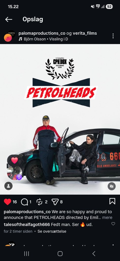 Hej og velkommen tilbage til endnu en update. Og undskyld den lange tids inaktivitet. Men jeg tænkte lige at jeg ville give jere der kun følger bloggene en kort update angående lanceringen af petrolheads. Men tænker ikke at der skal værre så meget snak. Så I får den nu her. Men jo der er jo verdenspræmiere her den 14 marts i Gran teater i københavn. Hvor at jeg skal i godmorgen Danmark samme dag altså d 14/03. Og så er der forevisninger rundt omkring i landet hele CPH DOX igennem. Hvor at der til flere af forevisningerne ville værre Q and A sessioner. Men ellers tænker jeg også at det er det. I må endelig holde øje med upgears facebook side der ville der løbende værre opdateringer især angående TV præmiere når det kommer. Men vi ses forhåbenligt Holder jer muntert.