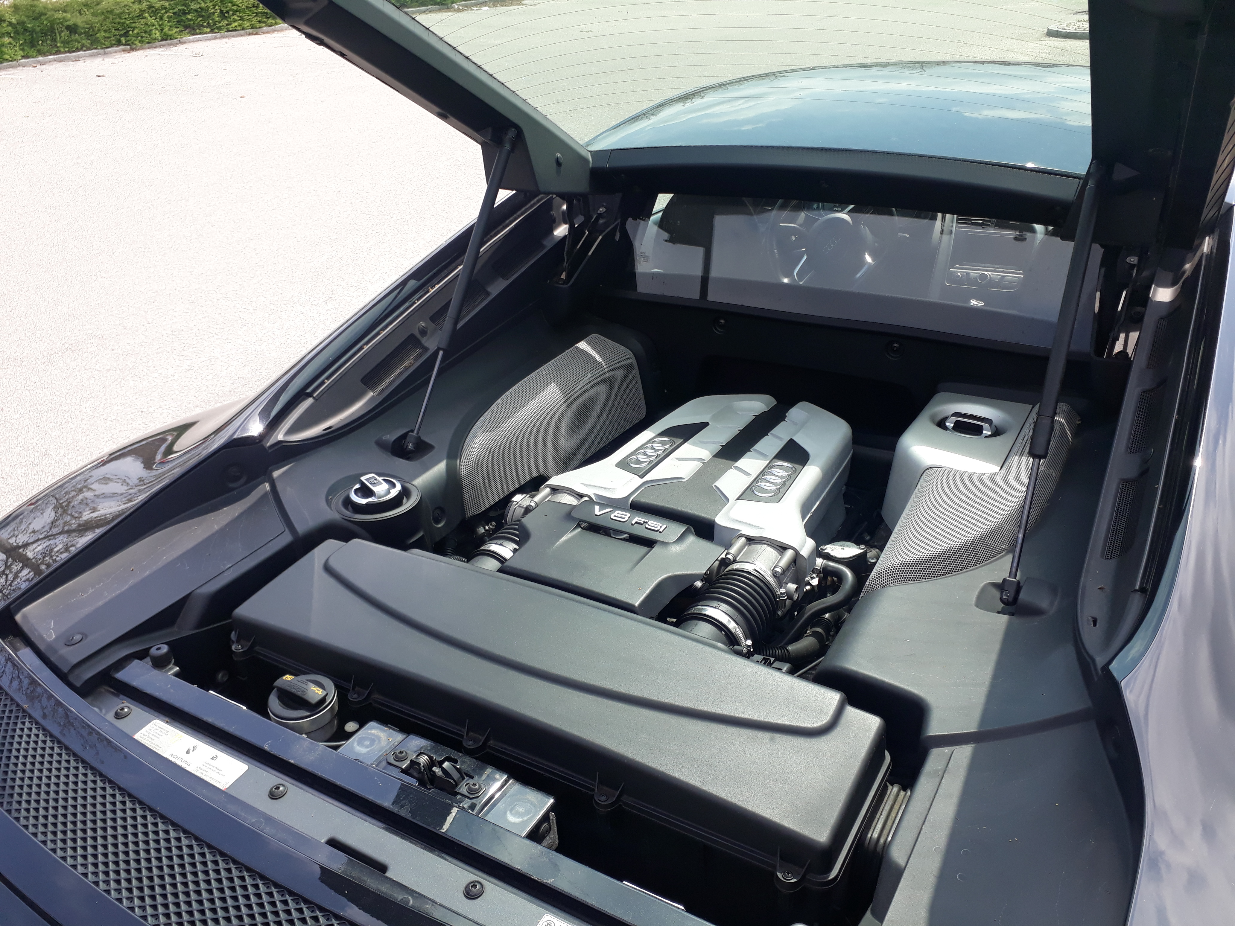 Efter en kort introduktion blev det min tur til at skulle prøve kræfter med den koksgrå satan. jeg tager plads bag rattet spænder mig fast i raketten og sætter maskinen i drive. hvor jeg så begynder at cruise stille derudaf for at kunne blive fortrolig med bilen. Allerede ved stille kørsel er en R8er en fornøjelse at værre fører på. Undervognen føles kontant uden at værre knusende hård og så er styretøjet helt perfekt vægtet imens at det styrer præcist. Alt dette er med til at bevirke at bilen føles virkelig nem at placere på vejbanen og at den føles fokuseret men stadigvæk underholdende at køre. De kulfiber keramiske bremser som selv på R8 var et pebret tilvalg til en sum på den gode side af 100.000 kroner havde virkelig godt bid når man trykkede på bremsepedalen. Jeg ved ikke om det var på grund af den høje lufttemperatur under dagens testkørsel eller andre faktorer der spillede ind og gjorde. At jeg hurtigere kunne opnå arbejdstemperatur i bremserne og derved mærke større forskel i forhold til andre Audi topmodeller jeg har kørt med samme tilvalg. Men jeg synes i hvert tilfælde at der var en mærkbar forhøjelse i mængden af bremsekræft i forhold til R8 V8 jeg kørte for et par år siden der var udstyret med standard hullede og ventillerede stålskiver. Angående motor og gear er denne bils superbils status helt klart berettiget efter min mening. Under en kort acceleration bliver man nærmest slynget tilbage i førersædet imens at V10eren vræler arrigt bag ens ryg. V8 udgaven var allerede en ganske kvik bil der kunne følge med det meste. Men 2 cylindre mere og cirka 120 heste ekstra gør altså underværker. Men det smukke ved en R8er er jo at det er en ganske letkørt bil. Den automatiseret manuelle gearkasse kræver dog en smule tilvænning fra folk der ikke har kørt en bil udstyret med denne type gearkasse. For eksempel skal man give den en bittesmule gas under igangsætning før at den begynder at trille og så skifter den ikke ligeså smidigt under stille kørsel som konverter automatgear. men jeg syntes stadigvæk at den klarer det godt nok til at det ikke føles distraherende. Men det er virkelig motoren der er hovedattraktionen i dagens testbil. Der er bare et eller andet over en stor multicylindret V motor der virkelig fascinerer mig. Under stille kørsel har man stadigvæk bundtræk nok til ikke altid skulle trække mange omdrejninger. Men den elsker stadigvæk at få omdrejninger så man skal helst køre i et lavere gear end normalt og under hurtige accelerationer bliver den virkelig vækket til live. Speederresponsen er også rimelig kvik. Den adlyder simpelthen hvert eneste vink. Også angående design er det her en sand superbil. Selvom at jeg altid bedst ville kunne lide coupen med dens herlige taglinje og ikoniske sideblade. Så har spideren begyndt at charmere sig ind på mig fraværet af et tag får nærmest ens øjne til at lægge endnu mere mærke til de brede hofter og tydlige bæltelinje der deler bilen op i en øvre og en nedre halvdel. Den ser med andre ord virkelig fræk ud med taget nede. For med kludetaget slået op ser den bare en smule uheldig ud. Efter min mening ligner det lidt en R8 krydset med en Ford streetKA. Men selv med fantastiske præstationer et fantastisk design og lækker mekanik så er der stadigvæk onde tunger der ville sige at R8eren ikke er en superbil. Men det er jeg ikke enig i selvfølgelig ligger R8eren i den lave ende af superbils-spektrummet men den har stadigvæk ligeså meget superstatus som de andre i klassen. Og efter at have kørt et par superbiler til bloggen forstår jeg fulgt ud sexappealen ved denne biltype. Man køber sig til eksklusivitet fart og højteknologiske ingeniør-løsninger. Men for en som mig der kan drage glæde af alle mulige biler uanset prisleje eller antal heste så er det fascinerende ved superbilerne at man modsat powersedanerne får en fintunet og formålsbygget maskine der er designet til at køre meget hurtigt rundt om en racerbane eller at køre i høj hastighed på et stykke motorvej eller en tosporet hovedvej med store bløde sving. På en måde kan man lidt sammenligne det med heste med at man har de gængse rideheste som de fleste ejer og på den anden side har man fuldblods-Arabere som gennem flere generationer er blevet forfinet igennem indavl med et formål for øje som er at kunne gallopere meget hurtigt rundt om en travbane. Men dommen lyder i hvert tilfælde på at uanset hvad folk siger så er en R8er en fantastisk bil og en fantastisk køreoplevelse. Og så tilføjer det helt klart noget positivt til køreoplevelsen at man har 10 cylindre og at man kan køre med taget nede.
