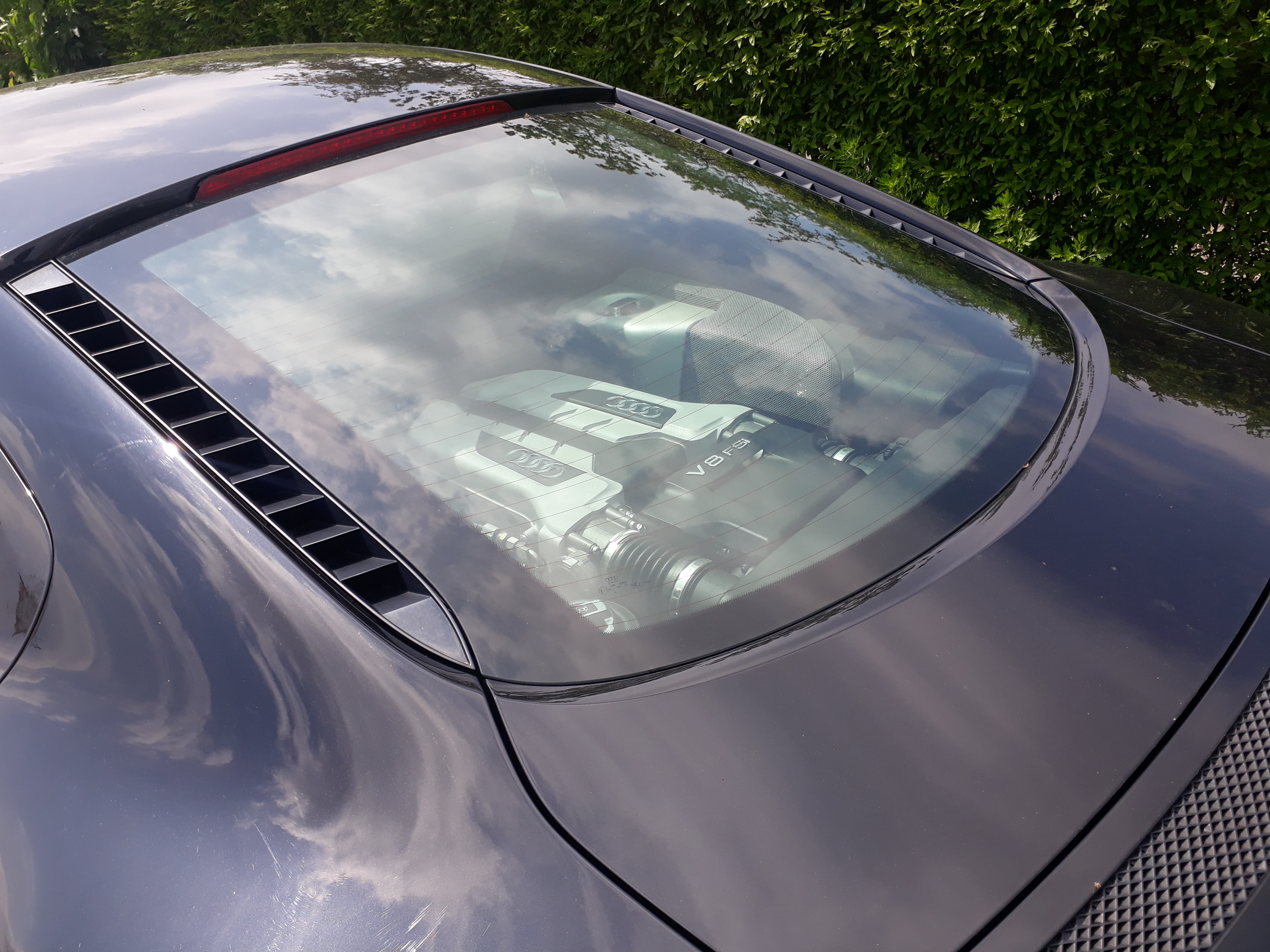 Den er ikke ligeså prestigefyldt som en ferrari. Men hvad betyder prestige ude i virkelighedens verden. For R8eren er efter min mening stadigvæk en imponerende bil. Den er lidt kulminationen efter mange års motorsports deltagelse. Audi som brand var i stor forandring op igennem 00erne. De gik fra at være lidt af et tredje rangs luksusmærke til at være blandt de bedste. R8 er det man på engelsk ville kalde en halo car. Altså en bilmodel som viser vejen frem angående teknologi præstationer osv. Nærmest en rullende reklamesøjle der har til opgave at få folk til at vise interesse i en bestemt bilproducent og forhåbentligt også deres billigere modeller i modelprogrammet. Det er en bil der blev udviklet med motorsports know how fra adskillige Lemans sejre. Men hvordan kører den spørger I sikkert. Ved lav hastighed føles den meget civiliseret der er ikke alt for meget rullestøj samtidig med at undervognen ikke er for stram. Men fordi at R8eren er udstyret med en automatiseret manual gearkasse og ikke normalt konverter automatgear. Skal man give en smule gas før at den begynder at krybe fremad. Men når man er i fart bemærker man ikke noget særligt. Så den kører stadigvæk mere smidig end en dobbelt koblings gearkasse. Noget der også er godt angående praktisk anvendelighed er at udsynet er rigtig godt og at side-spejlene har en regulær størrelse så man faktisk kan se hvad der kommer bagfra. Men lad os være helt ærlige så har sportsvogne og superbiler aldrig handlet om mondæne ting som pladsforhold og hvor store de blinde vinkler er. Men en ting de i hvert tilfælde handler om er hvordan de får en til at føle når man sætter sig bag rattet og begynder at køre. Og i den henseende udfører R8eren opgaven ganske fornemt. Ved stille kørsel kommer der et tilfredsstillende brøl ude fra motorrummet. Men bare ved en kort hurtig acceleration føles det som om at motoren tager en kontant og hurtig indånding hvor så at eksplodere i en fantastisk kraft udvikling. Det lyder rigtig godt og når det kobles sammen med en lavmeldt snurren fra gearkasse og differentiale er lydbilledet efter min mening så godt som fuldendt. Også det at accelerer er en fantastisk oplevelse. Fra 0 til 80 er der fuld knald på dramatikken gearkassen stryger igennem gearene med et tilfredsstillende ryk ved hvert gearskift. Når man så har passeret de 80 er det lidt ligesom hvis man er i et jetfly der har forladt ground effects det hele flader ud og bliver mere smidigt. Men stadigvæk med en konstant acceleration indtil at man slipper gassen. Også angående design tager R8eren sig godt ud den ligner virkelig den sportsbil i milionklassen den er. Jeg ville sige at det efter min mening er ét af de bedste bildesigns i det 21 århundred indtilvidere. propationerne er tydeligt dikteret af centermotor layoutet med at cockpittet er rykket frem i vognen hvor på at pladsen fra ildvæg og bagud er reserveret til motor og transaksel. Men det er bare så lækkert pakket ind med de brede hofter bagtil og den rette mængde luftindtag foran bagpå og på siderne. Apropos siderne kan man ikke undgå at lægge mærk til de såkaldte sideblades. Som er R8erens absolutte kendetegn. De skabte lidt af en kontrovers blandt bilnørder og andet godt folk da de først så dem. Men i dag syntes jeg at de er et genialt stilelement som giver designet dets egen identitet samtidig med at de skaber en fed kontrast til den karrosserifarve man nu har valgt. Men ellers lyder dommen på at hvis du er vild med ideen om en hverdags duelig sportsbil men at du syntes at en Porsche 911 er lidt for metervare agtig så kan det her helt klart være en mulighed.